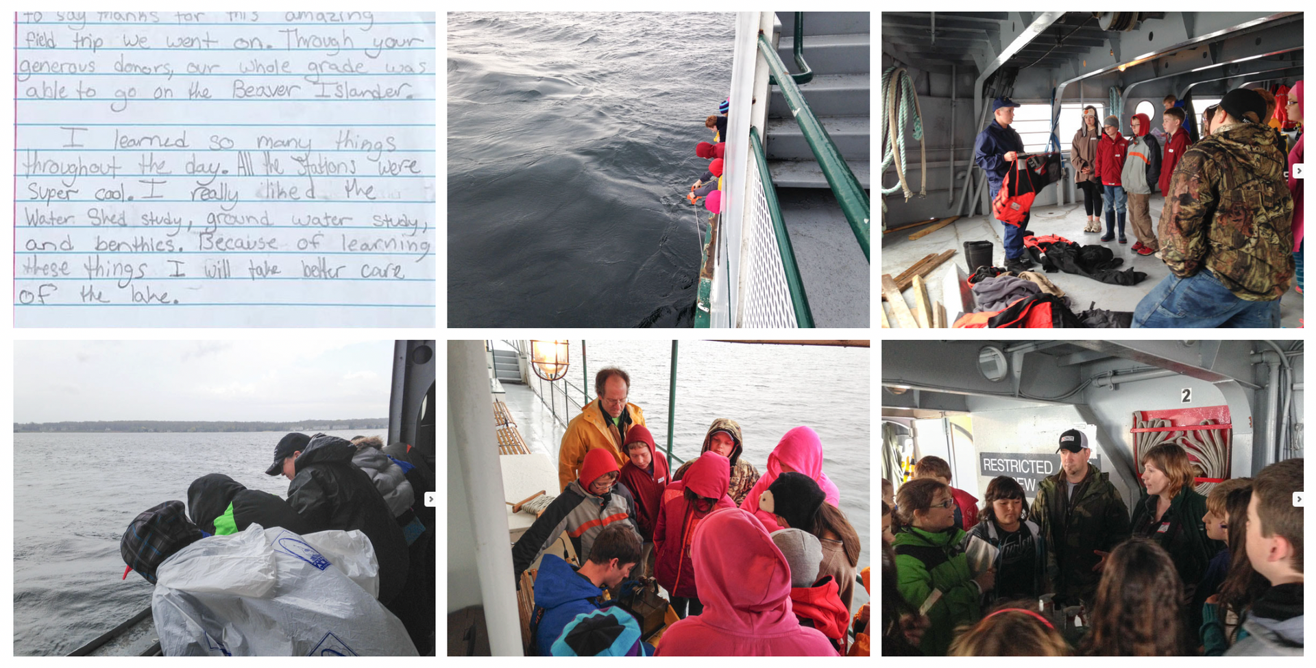 Every May the Lake Charlevoix Association and the Tip of the Mitt Watershed Council sponsor an event called Students Experience Lake Charlevoix (SELC) for approximately 300 area sixth and seventh graders. For the event, students board the Beaver Islander in Charlevoix, travel to the west bay of Lake Charlevoix and spend either a morning or an afternoon on board participating in experiments relating to water quality, watershed protection, invasive species, water safety and several other topics. The students rotate to seven different learning stations which are run by enthusiastic area volunteers. It’s a great, fun learning experience for everyone on board.
